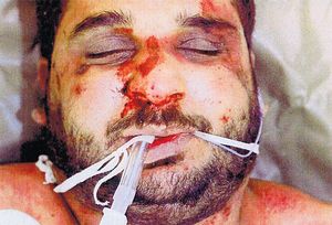 Baha Mousa, 26, Witwer und Vater zweier kleiner Kinder, starb an 93 Verletzungen infolge von Schlägen und Tritten, die ihm von Soldaten im September 2003 in Basra zugefügt wurden, von Soldaten des Ersten Bataillons des Lancashire Regiments Ihrer Majestät der Königin.
