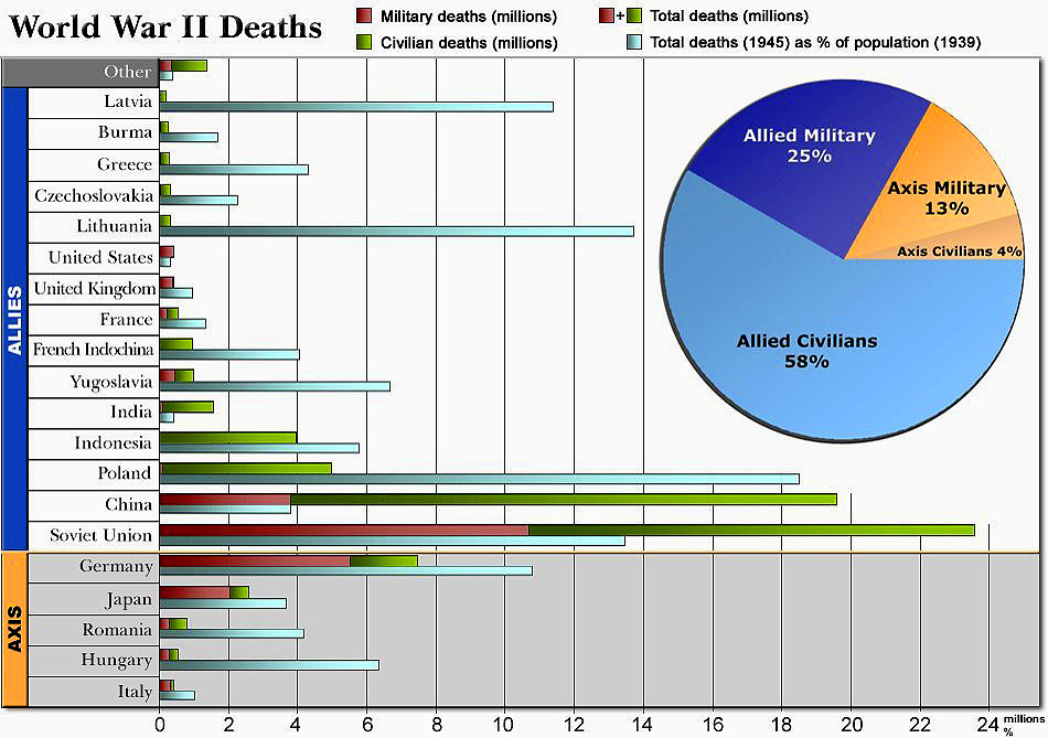 Am 9. Mai feiern das russische Volk und andere Völker der ehemaligen Sowjetunion den Tag des Sieges. Die Rote Armee der Sowjetunion war es, die die Armeen der Achsenmächte in der Operation Bagration (> LINK) + LINK + LINK) und auf ihrem Marsch nach Berlin ganz und gar besiegte. Militärisch gesehen war die D-Day-Invasion Kontinentaleuropas durch die Vereinigten Staaten von Amerika und deren westliche Alliierte bloß eine Ablenkung von den gewaltigen sowjetischen Offensiven im Osten. Ende August 1944 hatten die deutschen Kräfte und ihre Verbündeten im Wesentlichen den Krieg verloren. Diese Graphik, die viel zu wenig bekannt ist, zeigt die gewaltigen Opfer, die die Russen und andere gebracht haben. Sie erklärt, warum die Russen ihres Sieges gedenken.